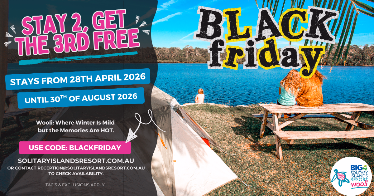 For a limited time, book 2 nights in a Villa, Cabin, or any Powered Site between 28th April 2026 and 30th August 2026 and get a 3rd night FREE! That’s one extra night of relaxation, adventure, and fun—completely on us!